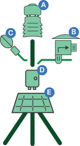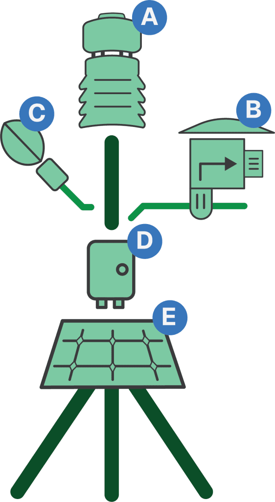 The CredoSense microclimate and spore monitoring station captures the environmental drivers and biological pressure signals that govern crop stress development and disease risk in both indoor and outdoor agriculture. Many systems rely on generalized conditions, but crop stress and infection risk are often controlled by local microclimate at the canopy level, including airflow, humidity, and leaf wetness. CredoSense measures these conditions using a microclimate monitoring system (A) and houses a proprietary fungal spore counter (B) within the same station to quantify airborne fungal pressure as a direct bio-threat signal. The leaf wetness sensor (C) is particularly important because it indicates host-environment suitability for infection, allowing spore pressure to be interpreted in the context of whether conditions are favorable for disease establishment and progression. The station is designed for continuous deployment and includes an onboard data logger (D) that records measurements and transmits them to the cloud through a cellular connection. It is powered by a solar panel (E) with a user-supplied battery in outdoor deployments, and it can be powered through facility power in indoor deployments. The fungal spore counter requires no consumables other than a HEPA filter and measures spore counts three times daily.