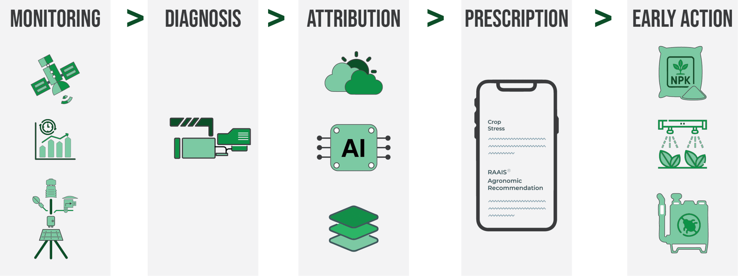 RAAIS is the CredoSense region-aware agronomic intelligence engine that converts multi-source measurements into a decision-grade conclusion about the primary stress driver and the next best agronomic action. It is grounded in plant ecophysiology and epidemiology: a correct attribution should be consistent with the crop’s physiological response, the root-zone and atmospheric drivers that regulate water and carbon exchange, and the biological pressure and environmental windows that enable infection and disease progression. RAAIS therefore fuses convergent evidence across crop response, soil and root-zone state, microclimate exposure, leaf optics and chemistry, and biological threat signals, and evaluates these signals in the context of crop type, growth stage, and recent management history.